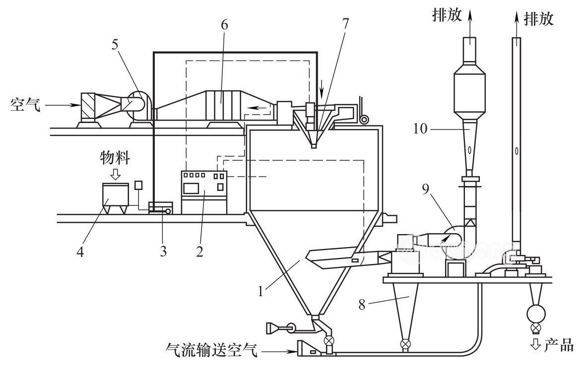 1—噴霧干燥塔;2—控制板;3—料液泵;4—料液貯槽;5—鼓風(fēng)機(jī);6—空氣加熱器;7—霧化器;8—旋風(fēng)分離器;9—引風(fēng)機(jī);10—文丘里洗滌器