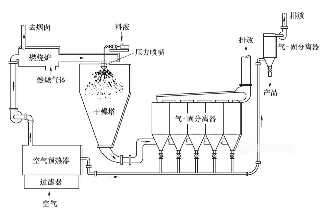 所謂噴霧干燥機(jī)開(kāi)式循環(huán)流程,就是采用的干燥介質(zhì)是空氣,干燥完成以后,廢氣排放到大氣中。