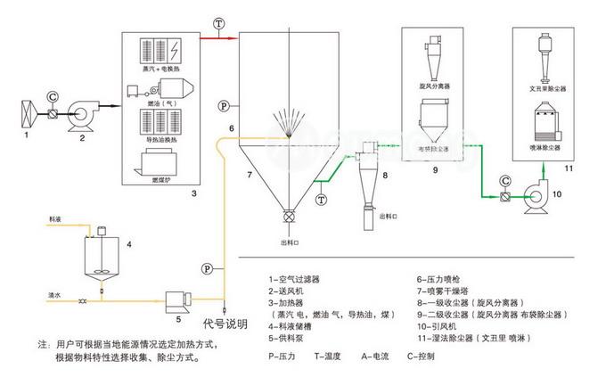 壓力式噴霧造粒干燥機(jī)主要由供料系統(tǒng)、干燥系統(tǒng)、除塵系統(tǒng)、加熱系統(tǒng)和電器系統(tǒng)組成,而每一系統(tǒng)又包括一些相關(guān)設(shè)備。